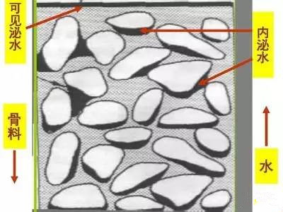 通俗地講,就是水泥混凝土中顆粒級配不合理,大直徑的顆粒比例比較大,使得水分不能夠均勻穩定地分散到顆粒間的空隙里,在混凝土運輸、振搗、泵送的過程中,水泥和骨料沉降,在混凝土凝固前產生水分滲出到混凝土表面的現象稱做泌水。