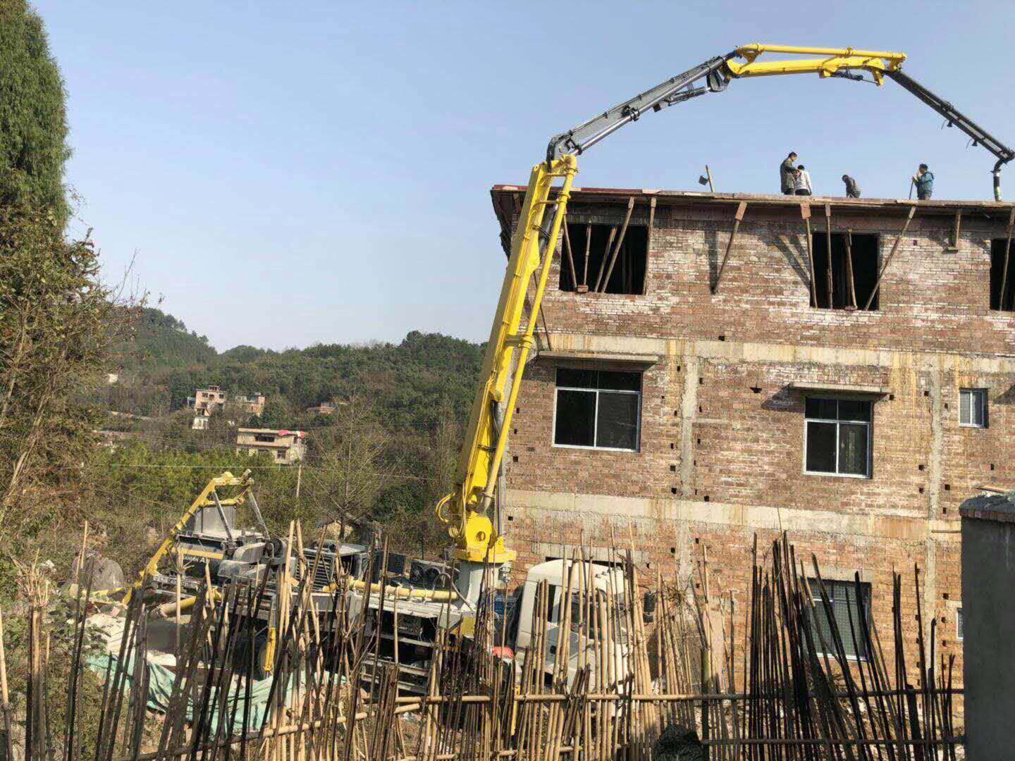 這是一種比較棘手的問題,也是泵車緊急故障中難以處理的一種。首先看是否是燃油缺乏或者燃油濾芯堵塞的原因,30分鐘-60分鐘內修復即可。如果不是就比較麻煩了,需撥打三民重科技術人熱線:400-0731-606等待緊急救援。等待救援過程中,可先將蓄能器卸荷截止閥打開,釋放蓄能器管路中壓力。在打開混凝土料斗下面的排放閥,放掉混凝土。另外用水沖洗料缸和 S 閥。待該料缸沖洗干凈后,松開S 閥小軸上調節切割環間隙的大螺母,卸掉兩個擺缸上的高壓管,利用撬棍或者鋼管將 S 閥推向已經沖洗干凈了的料缸一邊,直至將仍然有混凝土的另外一個料缸露出口來,然后進行高壓水沖洗,清除該料缸內的混凝土。救援泵車到達之后,打開有故障泵車的變徑管和水平管連接的部位,在水平管內塞入濕過水的海綿球;卸下救援泵車的尾膠管,將救援泵車布料桿上的后一個彎管和故障泵車的水平管連接起來,救援泵車的料斗內注滿水,然后救援泵車進行泵送,利用救援泵車將故障泵車輸送管內的混凝土泵排除出去,消除混凝土凝固的危險。在兩個泵車連接之前,必須首先將救援泵車輸送管內的混凝土排除出去。