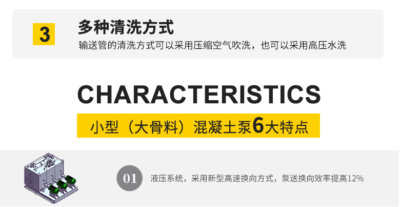 簡介:三民重科生產的小型(大骨料)混凝土泵也屬于混凝土輸送泵,它的性能特點很多,比如高效液壓系統,采用新型高速換向方式,泵送換向效率提高12%;大排量泵送系統,吸入效率提高6%,滿足各種工況需求。
