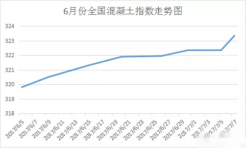 截止07月07日,混凝土價格指數為 323.35 較06月02日320.75 上漲2.6,較16年同期相比上漲54.9,
