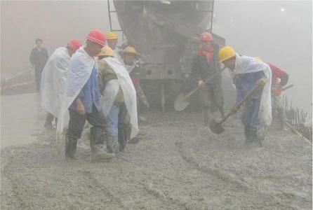 (四)操作指導 1、加強對天氣預報資料的收集工作,及時掌握天氣情況,以便采取有效的防范措施,對已澆砼要盡早覆蓋以防砼在終凝前遭雨水沖淋。 2、當在砼澆筑過程中有小雨但尚不會直接影響砼質量時,則砼澆筑可連續不間斷進行,攪拌站降低混凝土拌合物的坍落度,并延長毎罐的攪拌時間,一般毎罐混凝土可延長30s?;炷翝仓r,每次的澆筑寬度不宜超過1.5m,同時增加振搗次數。同時要對已澆砼立即進行覆蓋,以免雨水直接沖洗砼,并將澆筑區所積雨水及時排走。 3、當砼澆筑時突降中大暴雨但其持續時間較短(2小時左右),則應將已入模的砼立即予以覆蓋并改為間斷地用砼進行覆蓋澆筑處理,砼澆筑間隔時間應小于砼的初凝時間,以避免該處出現施工冷縫。雨停后及時清除積水并重新恢復砼正常澆筑施工。