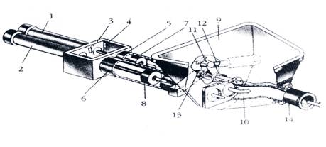 (1)(2)主油缸;(3)水箱;(4)換向裝置;(5)(6)混凝土缸;(7)(8)混凝土活塞;(9)料斗;(10)分配閥;(11)擺臂;(12)(13)擺動油缸;(14)出料口 混凝土缸活塞(7、8)分別與主油缸(1、2)活塞桿連接,在主油缸液壓油作用下,作往復運動時,一缸前進,則另一缸后退;混凝土缸出口與料斗連通,分配閥一端接出料口,另一端通過花鍵軸與擺臂聯接,在擺動油缸作用下,可以左右擺動。 泵送混凝土料時,在主油缸作用下,混凝土活塞7前進,混凝土活塞8后退,同時在擺動油缸作用下,分配閥10與混凝土缸5連通,混凝土缸6與料斗連通。這樣混凝土活塞8后退,便將料斗內的混凝土料吸入混凝土缸,混凝土活塞7前進,將混凝土缸內混凝土送入分配閥泵出。 當混凝土活塞(8)后退至行程終端時,觸發水箱3中的換向裝置4,主油缸1、2換向,同時擺動油缸12、13換向,使分配閥10與混凝土缸6連通,混凝土缸5與料斗連通,這時活塞7后退,8前進。如此循環,從而實現連續泵送。 反泵時,通過反泵操作,使處在吸入行程的混凝土缸與分配閥連通,處在推送行程的混凝土缸與料斗連通,從而將管路中的混凝土抽回料斗。 這就是我參與你們人類工程建設時的工作方式了。以后,遇到問題后可再也不能采用粗魯的行為來報復我們了,我們工作也是很辛苦的。再說了,“快樂工作,效率翻倍”,是吧!