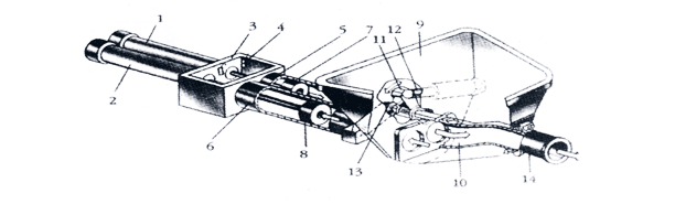 (1)(2)主油缸;(3)水箱;(4)換向裝置;(5)(6)混凝土缸;(7)(8)混凝土活塞;(9)料斗;(10)分配閥;(11)擺臂;(12)(13)擺動油缸;(14)出料口 小型混凝土輸送泵的活塞是與主油缸的活塞桿連接,在主油缸液壓油作用下,作往復運動時,一缸前進,則另一缸后退;混凝土缸出口與料斗連通,分配閥一端接出料口,另一端通過花鍵軸與擺臂聯接,在擺動油缸作用下,可以左右擺動,這就是達到往外推。