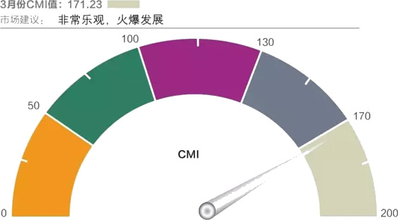 2017年3月份中國工程機械市場指數即CMI為171.23,同比增長25.66%,環比增加57.66%。2017年3月份中國工程機械市場指數比上月提高62.62點,比上年同期提高34.97點,同比、環比繼續增長,而且也創下了2011年7月CMI指數創立以來的高值。