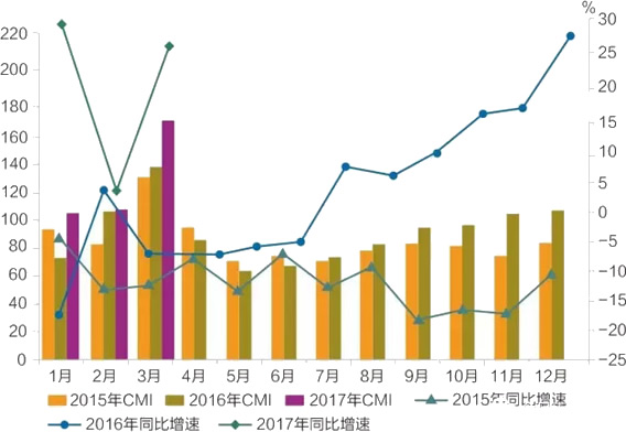 2015年-2017年CMI指數及同比增速變化趨勢
