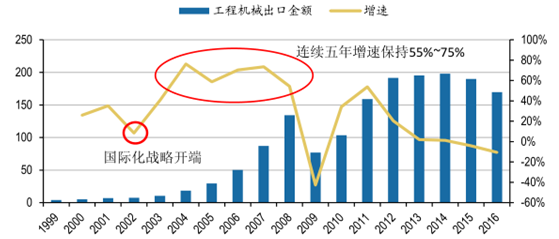 二十世紀九十年代,我國工程機械開始出口,彼時工程機械技術水平較國際水平差距較大,加之銷售渠道少,出口量極少。進入二十一世紀,國內各大工程機械企業,都開始將國際化作為公司的核心戰略之一,中國工程機械企業的國際化之路就此開始。